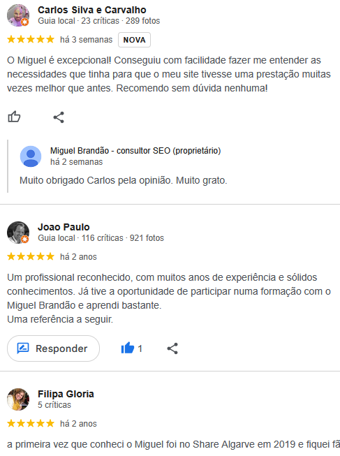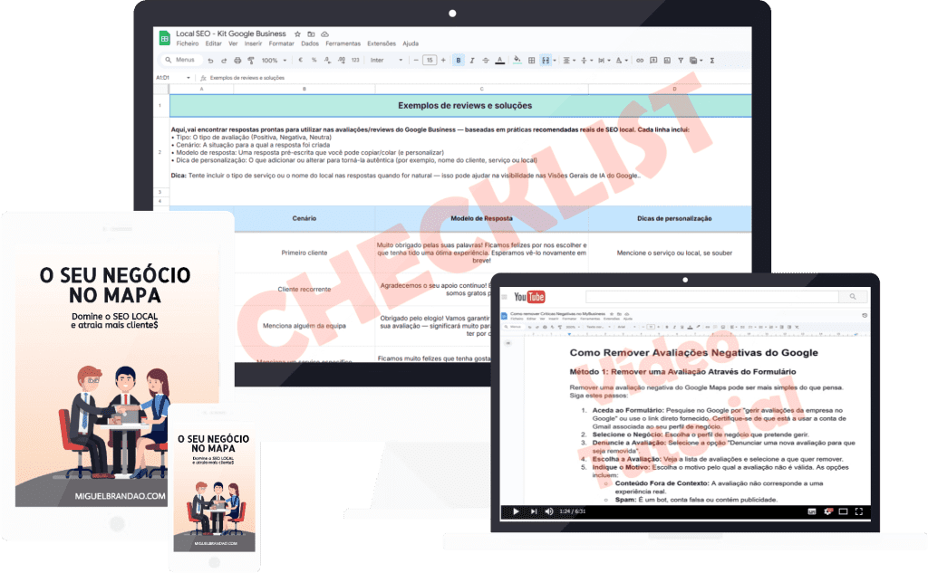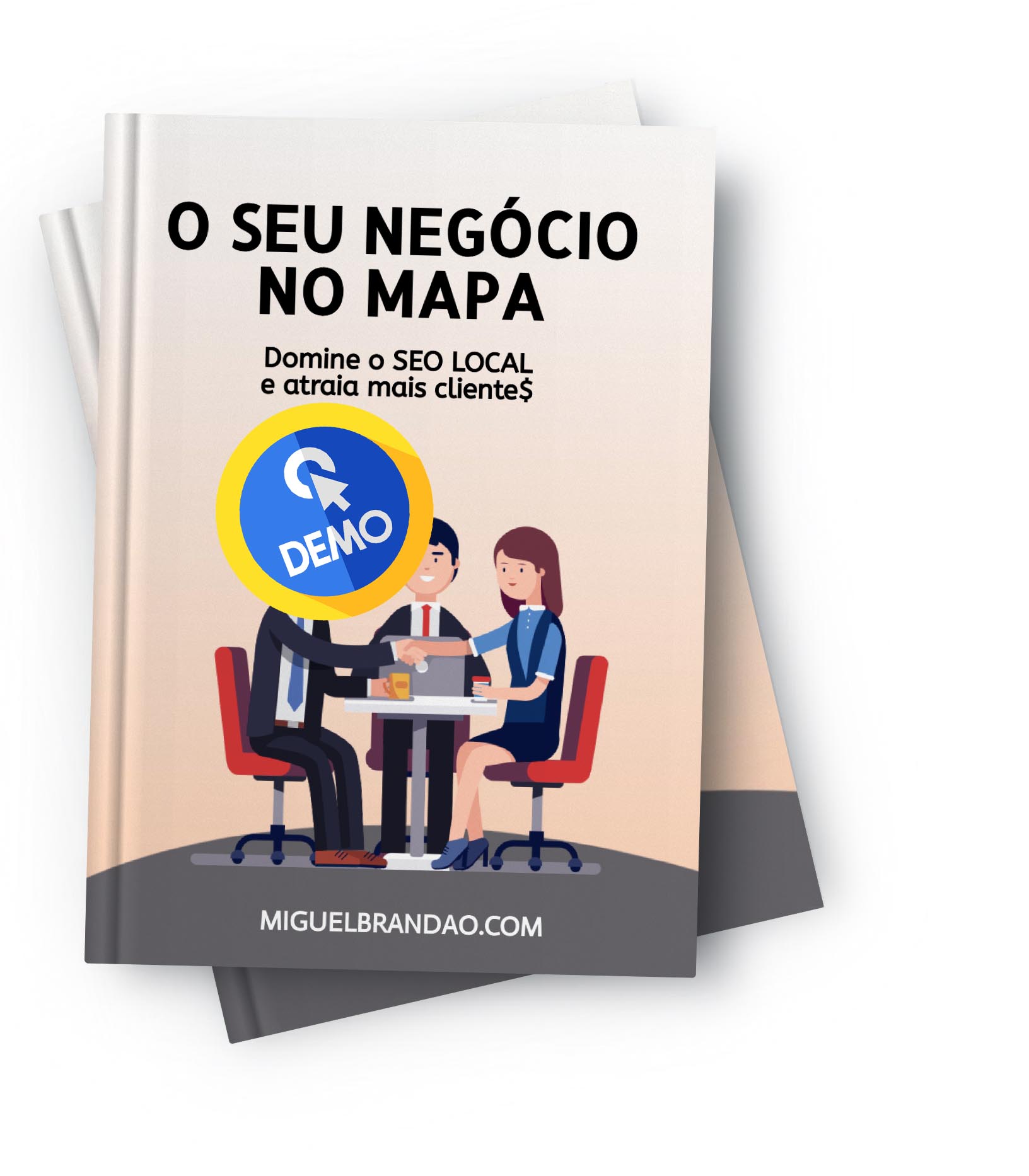 Ao comprar o kit completo de SEO Local, vai ter acesso ao Ebook – O seu negócio no Mapa – domine o SEO Local e atraia mais cliente$ com mais de 100 páginas de informação, dicas e estratégias. Vai ter acesso a 3 bónus: checklist para configurar o perfil da empresa no Google Business, checklist para gestão de comentários, vídeo tutorial de como fazer para remover comentários negativos.