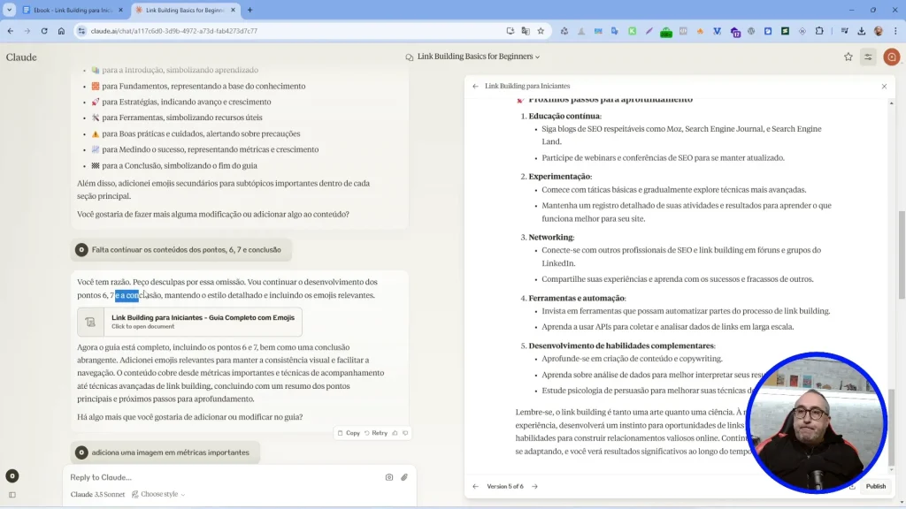 Após estruturar o conteúdo, pode refinar cada seção. Por exemplo, peça à IA para desenvolver mais detalhes em cada um dos pontos. Use prompts como “desenvolver mais sobre a importância do link building“. A IA irá expandir o conteúdo, tornando-o mais rico e informativo.