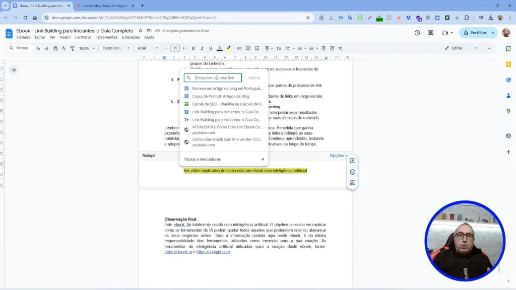 Após criar a sua conta, já pode começar a gerar conteúdo. Por exemplo, digite um prompt como “criar um e-book sobre link building para iniciantes“. A IA começará a gerar o texto automaticamente!